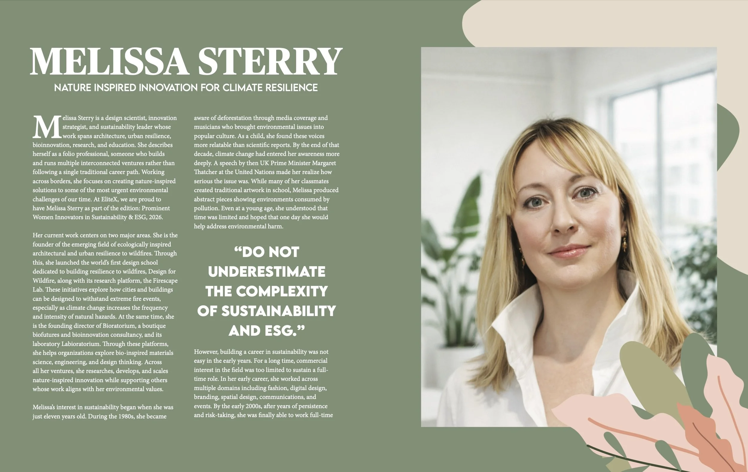 Melissa Sterry is a globally recognised scientist, designer, strategist, and futurist specialising in sustainable innovation, biodesign, and resilience. Founder of several internationally acclaimed first-to-market start-ups and other seminal initiatives, she pioneers unprecedented nature-inspired design solutions to highly complex environmental challenges. With 25+ years board-level experience and qualifications including a PhD in designing ecomimetic architectural, urban, and peri-urban resilience to major wildfires, and a postgraduate in innovation and enterprise, she advises market-leading companies and agencies on cutting-edge sustainability, innovation, and development strategies. Her expertise in design science, complexity, biotechnology, biomimetics, and ecological systems thinking positions her as an international thought leader in natural hazard resilience, climate adaptation, and ecological design. Chartered with the Science Council, a member of the Design Council’s expert network and of the Bureau of European Design Associations MADres initiative the G42 group, she is a fellow of the Design Research Society and the Institute of Science and Technology.